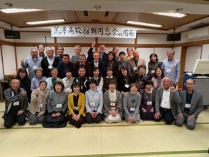 令和7年11月8日(土)、昨年、母校キャンパスプラザで開催された古希記念同窓会で、来年は私がしますと手を挙げた大上磯松・真理子(同窓生カップル)が中心となり幹事会を結成し、幹事長の地元丹波篠山で同窓会が開催されました。遠くは北海道と福岡から、また初参加も含めて総勢36名が集まりました。夕礼の再現や秘蔵写真をスクリーンに写し、飲むのもカラオケも忘れて声を枯らして叫びあって、あっという間に零時を越えてしまいました。翌日は陶工大上さんの夢工房で陶芸教室が開かれ轆轤を回し、その後陶芸美術館を見学し、美味しいイタリアンで昼食をとり解散しました。6年後、喜寿の同窓会は学園で、を合言葉にそれぞれ家路につきました。(記:田島忠篤)