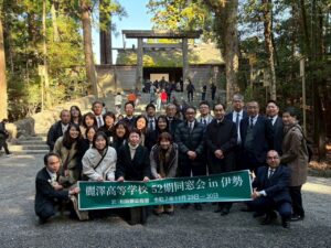 1日目は廣池千九郎先生も宿泊された旅館・松阪屋吸霞園(伊勢市二見町)に集合。その後、夫婦岩のある二見興玉神社にてお祓いを行い、心身を清めました。夜には旅館にて同窓会。一人ずつ参加者の近況報告があり、また恩師の先生方からも麗澤高校を退職されてからもそれぞれがご活躍をされている様子を伺いました。